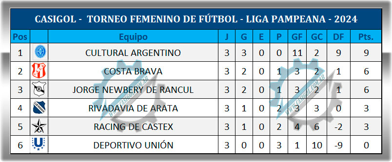Se disputó la tercera fecha del torneo femenino de fútbol de primera división que organiza el departamento de la especialidad de Liga Pampeana. La jornada se llevó a cabo en cancha de Jorge Newbery  con los tres partidos de la jornada. En primer turno Costa Brava se impuso al local Jorge Newbery por dos a uno,  Deportivo Unión cayó con Rivadavia de Arata por tres a uno y cerró la jornada Cultural Argentino goleando a Racing por cinco a dos.