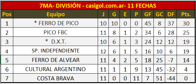 En la noche del viernes y en la mañana de hoy se disputaron los encuentros de séptima división del torneo de Liga Pampeana. Recordamos que Ferro había ganado anoche en Intendente Alvear ante el verde alvearense y en el día de hoy jugaron en el "volcán" de barrio Pacífico Pico Fbc vs Costa Brava y Sportivo Independiente vs. Cultural Argentino.