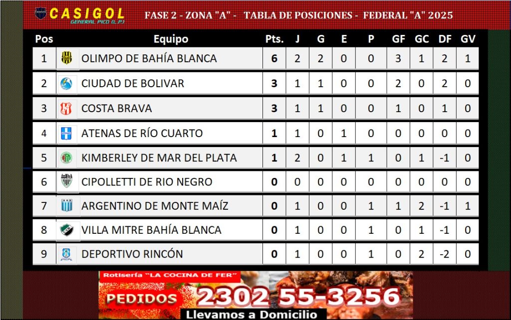 De esta forma, los dirigidos por el píquense Mauricio "Buli" Giganti, puntean en la zona "A" con seis puntos, productos de dos triunfos en dos presentaciones y a la espera de lo que pueda hacer Ciudad de Bolívar en su presentación en Bahía Blanca.
