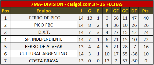 Anoche se disputó en el estadio "Roberto Petit de Meurville" la fecha nro 16 del torneo de séptima división (segunda de la tercera rueda) . En primer turno Cultural Argentino derrotó a DXT por uno a cero, luego igualaron uno a uno Pio FBC y Ferro de Alvear y en el cierra el puntero Ferro de Pico obtuvo un triunfo por la mínima ante Sportivo Independiente.
