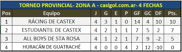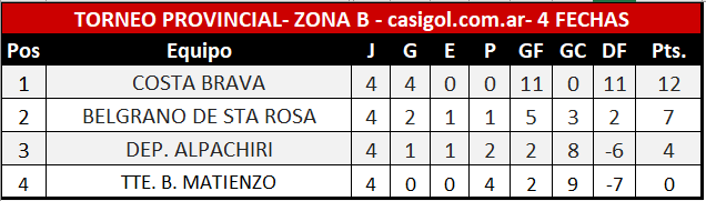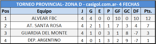Se disputó la cuarta fecha del torneo provincial de fútbol José "topo" Gonzalez, en las cuatro zonas. En la D Alvear ya consiguió la clasificación tras la goleada ante Guardia del Monte, en la B, Costa también se metió y en el resto aún hay esperar para ver quienes serán los que clasificarán para la etapa final del torneo.