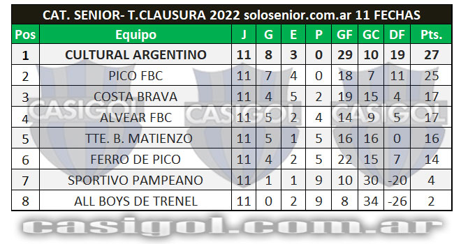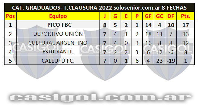NOTA: Hasta el momento igualan el segundo lugar Caleufú y Ferro de Pico, pero es segundo Caleufú porque si bien en los partidos entre ellos ganó Caleufú en la primera rueda uno a cero, en la revancha fue Ferro quien se impuso por igual marcador, Caleufú tiene mejor diferencia de gol y por tal motivo es segundo relegando a Ferro al tercer lugar.