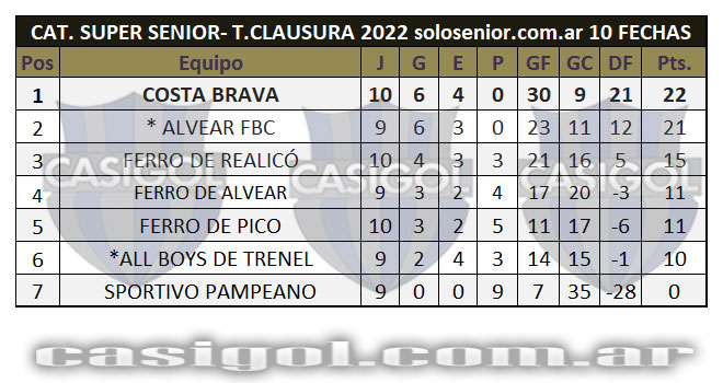 NOTA: Hasta el momento igualan en el tercer puesto Costa Brava y Alvear FBC, pero es tercero Costa Brava porque en los partidos jugados entre ellos ganó uno a cero en la primer rueda, e igualaron sin goles en la revancha.