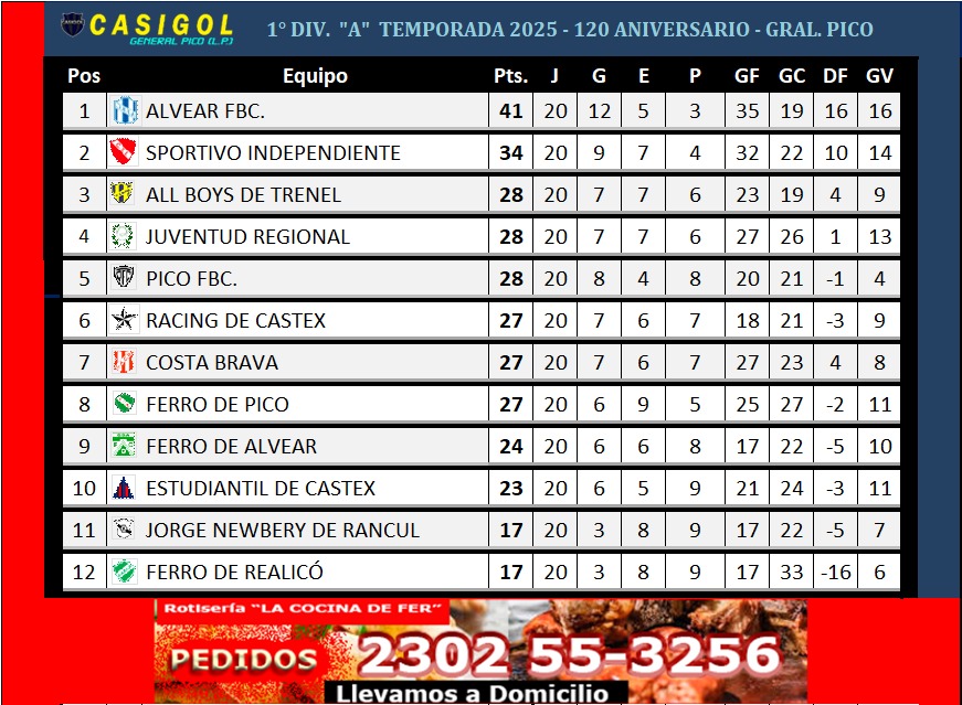 En la "Villa Sportiva"; Sportivo Indepediente, goleó y con ese valioso triunfo sigue en la punta compartida con Alvear, que también ganó en Castex ante Racing.
