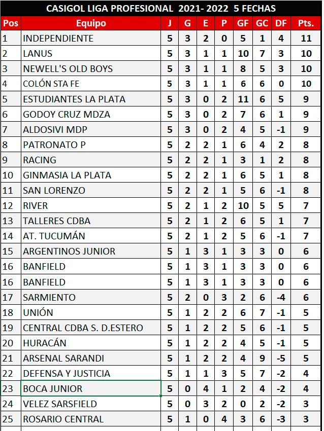 Con tres encuentros se completó la quinta fecha de la Liga Profesional de fútbol Argentino. El triunfo de Aldosivi ante Defensa y Justicia, el empate entre Arsenal y Patronato dos a dos y el triunfo de Estudiantes en Santiago del Estero ante Central Córdoba por dos a uno. Recordamos que el único grande que ganó fue Independiente en el clásico ante Rácing y se subió a la punta del torneo.