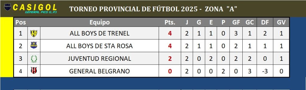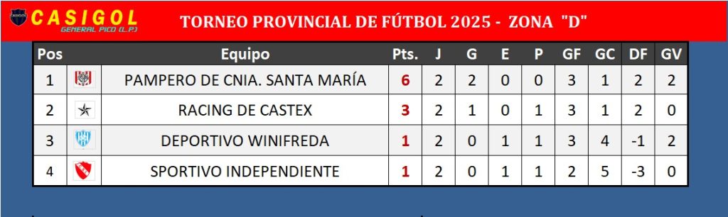 Ganó Pico FBC por la zona "C", empataron Juventud Regional y All Boys de Trenel y en Castex Racing derrotó a Sportivo Independiente por tres a cero en la zona D, tambiérn ganaron All Boys de SR, At. Santa Rosa el Pampero de Cnia Santa María y había Ganado Unión de Miguel Riglos en la noche del sábado.