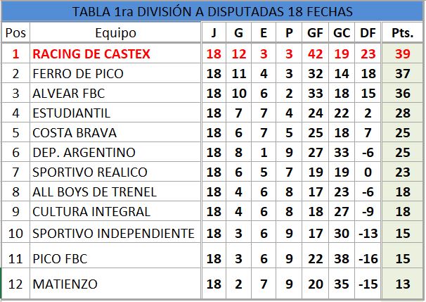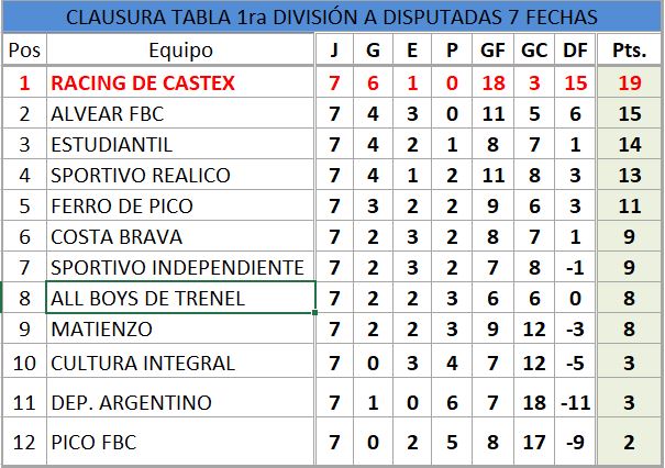 Finalizó la séptima fecha del torneo clausura de fútbol de Liga Pampeana, ganaron Racing, Alvear, Sportivo y Costa, empate de Estudiantil e Independiente.