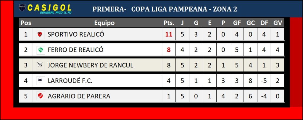La sexta fecha de Copa Liga, se comenzó a jugar el viernes con el empate entre Ferro de Pico y Rivadavia de Arata, continuó en "El Volcán" con el triunfo de Cultural Argentino sobre el Depo. de Quemú tres a sos, ya en sábado Ranqueles y Pico FBC igualaron uno a uno y Jorge Newbery derrotó dos a uno a Agrario, hoy se disputaron dos partidos triunfo de Sportivo Realicó en Larroudé y de Cultura Integral a Sportivo Independiente por dos a cero. Completan la sexta fecha del torneo de Copa Liga Pampeana, Completaron la fecha, en el Héctor Winchel, el clásico entre Martini FC. y Alta Italia por la zona 1.