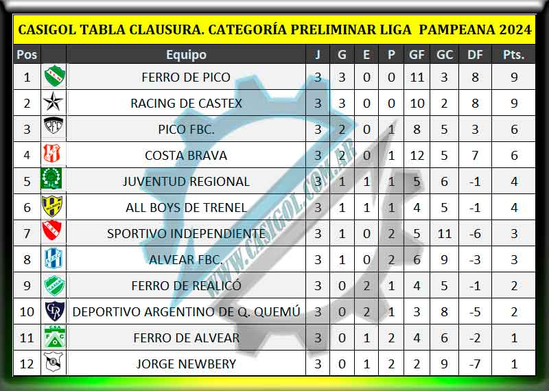 TABLA DE POSICIONES CLAUSURA CATEGORÍA PRELIMINAR