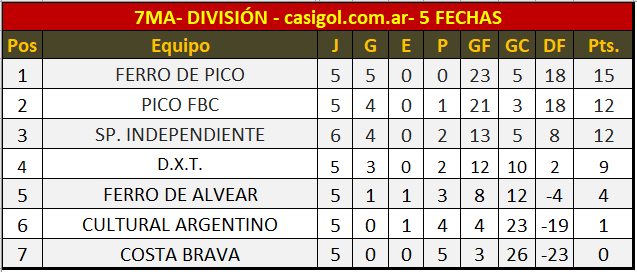 En el día de hoy en el "Nuevo Pacaembú" se disputaron los tres partidos de  la sexta fecha de séptima división. En primer turno Sportivo Independiente derrotó a Cultural Argentino por tres a uno, luego la jornada continuó con el triunfo de Ferro de Pico sobre su homónimo de Alvear por tres a dos y en tercer turno el dueño de casa cayó con el Pico FBC por ocho a cero.