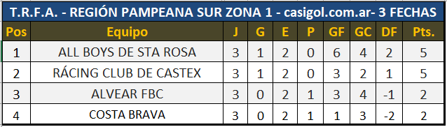 Se disputó la tercera fecha del Torneo Regional Amateur para la Región Pampeana Sur, Zona 1. En Santa Rosa All Boys igualó en dos tantos por lado con Alvear FBC con dos tantos de Jerónimo Gutierrez en tanto que para los de Ramos convirtieron Alex Sosa, y Emanuel Morete. En Castex, Rácing y Costa igualaron cero a cero y todo sigue como al principio de esta fecha, porque All Boys y Rácing tienen 5 y Alvear y Costa Brava tienen dos puntos cada uno.