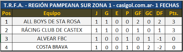 Arrancó el torneo TRFA y en la Región Pampeana Sur se enfrentaron en Santa Rosa All Boys de Sta Rosa y Costa Brava y en el estadio de la Avenida Alvear FBC recibió a Rácing de Eduardo Castex.