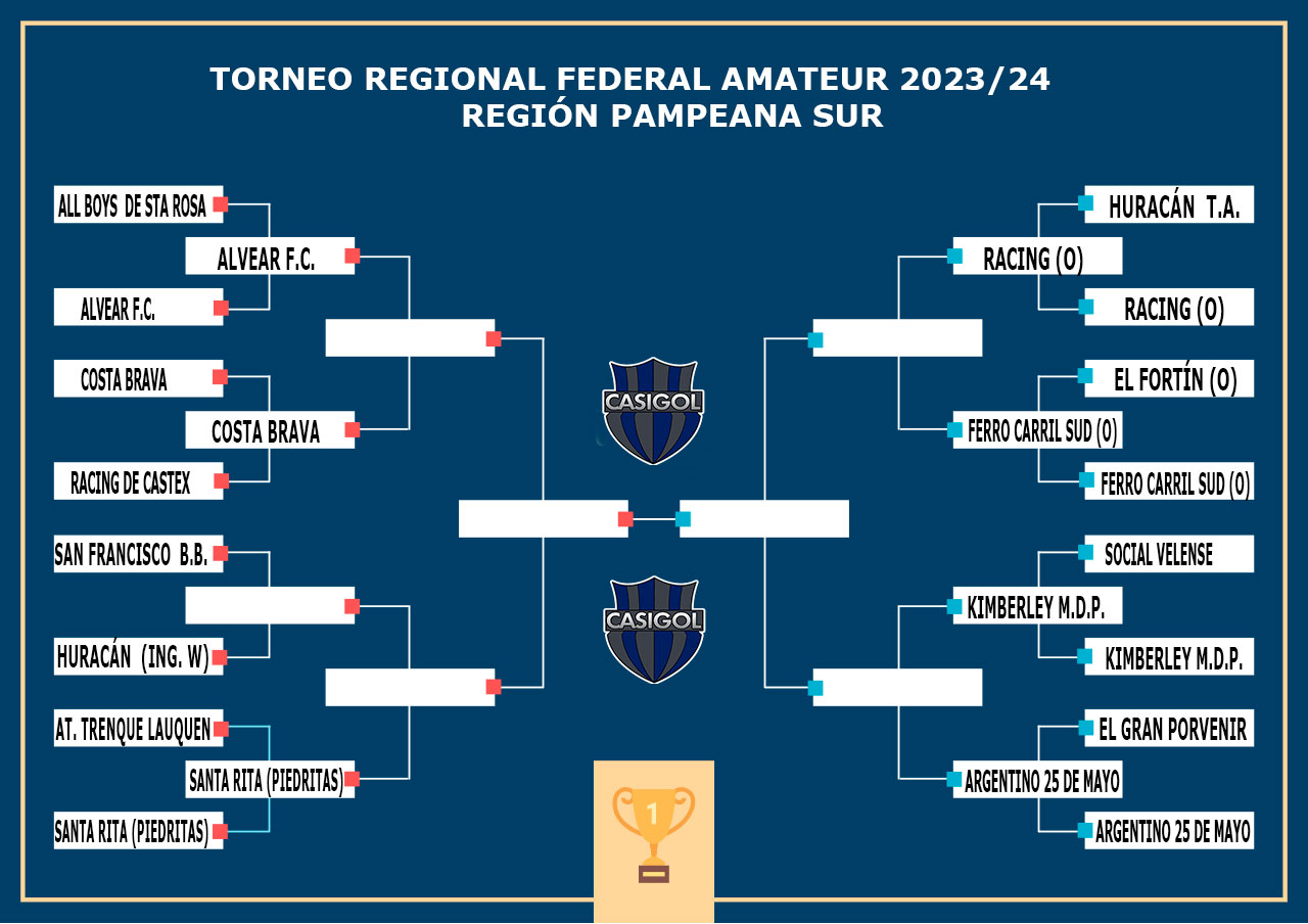 En el transcurso de la semana se van conociendo los clasificados a los cuartos de final en la Región Pampeana Sur del Torneo Regional Federal Amateur. Como ya conocemos Alvear y Costa será uno de los cruces que tendrán lugar en esta instancia, per también por el mismo lado del cuadro clasificó Santa Rita de Piedritas dejando en el camino a At. Trenque Lauquen y espera rival que saldrá de quien resulte ganador del encuentro entre Huracán de Ingeniero White y San Francisco de Bahía Blanca. Dicho partido se llevará a cabo el próximo miércoles 29 de diciembre a las 17:hs. y recordamos que en la ida como local se impuso el conjunto de San Francisco.