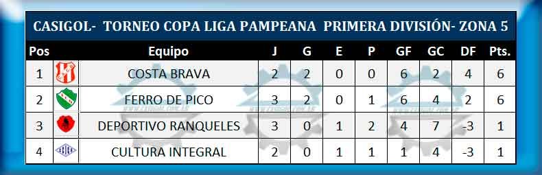 En el día de hoy se disputó la tercera fecha del torneo Copa Liga Pampeana de fútbol. El adelantose debe a que en el día de mañana se llevará a cabo las elecciones nacionales. Anoche en el adelantado empataron por la zona 1 At. Catriló y Juventud Regional sin abrir el marcador, y en el día de hoy fueron suspendidos por mal tiempo el encuentro entre Caleufú Tte. B. Matienzo y el de Rivadavia y Costa de Luiggi, de la zona 3 y por la zona 5 en el "Oscar Avelino Dolce" Cultura Integral, Costa Brava. De lo que se jugó a primera hora ganó Racing, luego Cultural Argentino hizo lo propio ante Estudiantil y Jorge Newbery derrotó en el "CIncuentenario" a Ferro de Realicó. El partido entre Ferro de Alvear y Sportivo Realicó fue suspendido cuando iban 14' del complemento por mal tiempo. En último turno en el "Carlos Sierra" Deportivo Argentino venció a Belgrano de Villa Mirasol.