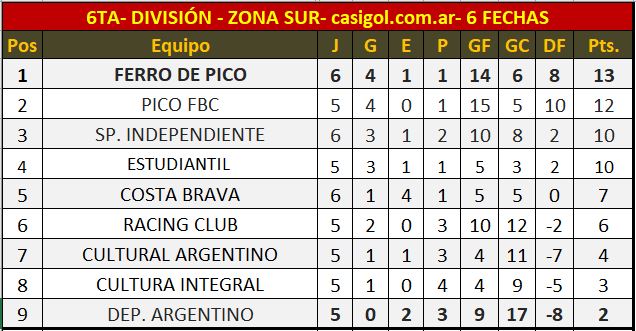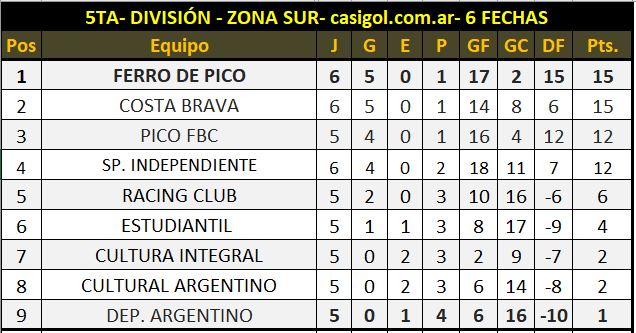 TABLA DE POSICIONES ZONA SUR