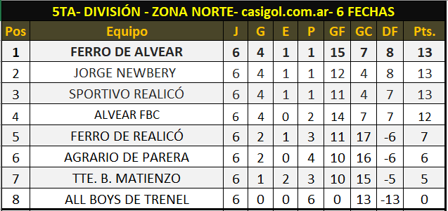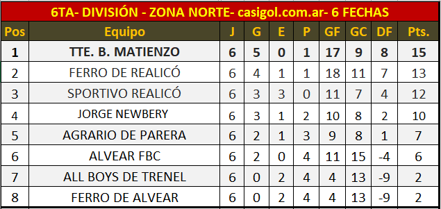 TABLA DE POSICIONES ZONA NORTE