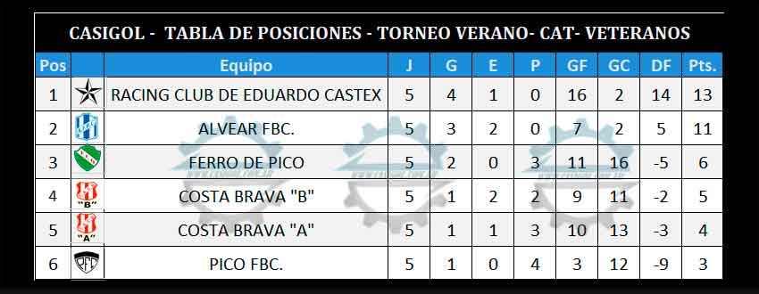 Así quedó la tabla final del tornedo de veteranos de fútbol  y hoy juegan en el partido uno Costa Brava "A" con Costa Brava "B", en el partido uno   y  Ferro de Pico  con Pico FBC en el partido dos.