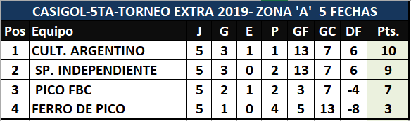 Se jugaron los minutos restantes de los encuentros de quinta división del torneo extra de divisiones inferiores, en el cuál restaban por disputarse 20' del encuentro entre Sportivo Independiente y Ferro de Pico y los 22' de Pico FBC y Cultural Argentino. El primer mini encuentro dio comienzo a la hora 20 disputándose dos tiempos de 10' cada uno, en tanto que el segundo encuentro dio comienzo a la hora 21 y se jugaron un tiempo de 11' y el restante de 12'.