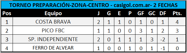 En al adelantado de la zona centro del torneo preparación organizado por Liga Pampeana, Costa Brava y Sportivo Independiente igualaron cero a cero. El motivo del adelanto se debe a que el conjunto albirrojo juega por el torneo provincial del próximo domingo de local ante Dep. Alpachiri.
