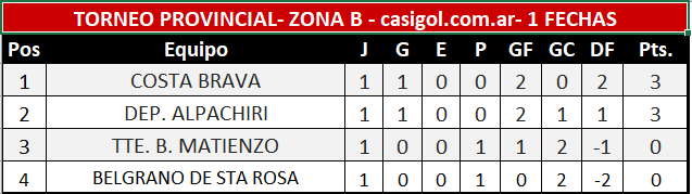 De esta forma en esta zona ya se jugaron los dos encuentros de la primera fecha y con el triunfo de Costa Brava el pasado jueves, el albirrojo y Dep. Alpachiri marchan punteros con tres unidades cada uno.