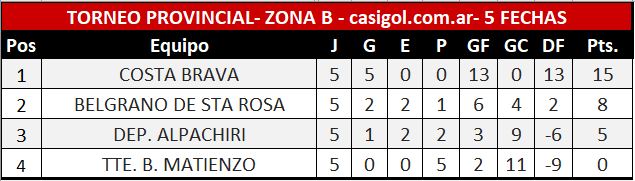 El cierre de la quinta fecha del torneo Provincial José 'topo' González, fue por la zona 'B', en la cual en el "Nuevo Pacaembú" se enfrentaron Costa Brava y Tte. B. Matienzo.