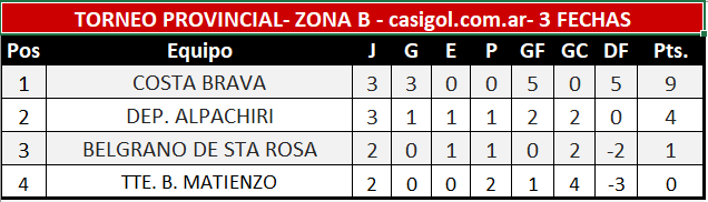 Por la zona "B", Dep. Alpachiri y Costa Brava abrieron la tercera fecha del torneo provincial de fútbol Jose "topo" González.  En un partido parejo en el arranque Costa  se mostró mejor y de a poco fue torciendo las acciones hasta que el debutante Gonzalo Turri abrió el marcador con el cual se fue al descanso.
