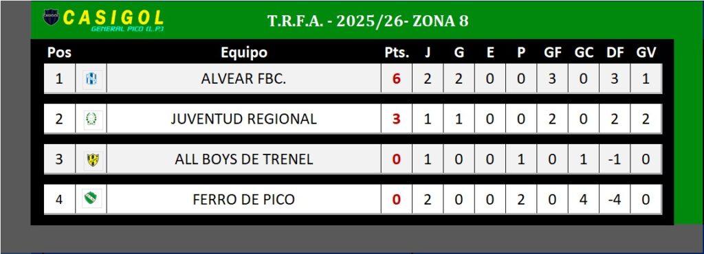 TRFA: ALVEAR FBC. SE IMPUSO CON AUTORIDAD, POR LA SEGUNDA DE LA ZONA 8