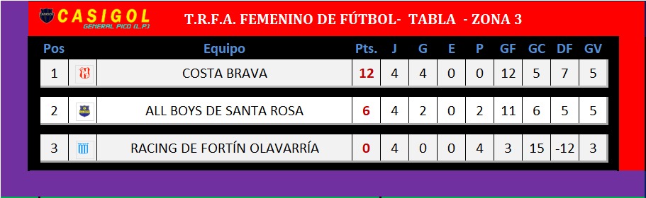 Costa Brava culminó su participación en la zona tres del TRFA femenino de fútbol, jugando y ganando por tres a cero en Fortín Olavarría ante Racing, por la sexta fecha.