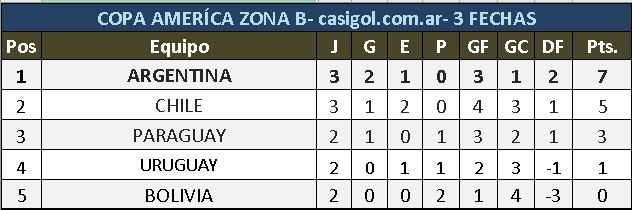 Por la zona B Argentino enfrentó a Paraguay en la tercera fecha de la Copa América.  En primer turno Uruguay y Chile igualaron en un tanto por lado, y en el día de ayer por la zona A Venezuela y Ecuador igualaron dos a dos y Perú dio cuenta de Colombia por dos a uno. Los de Scaloni arrancaron mejor y rápidamente llegó al gol cuando a los 10' Alejandro "papu" Gómez metió una diagonal del medio hacia afuera y allí lo vio Di María que le puso el pase justo para que éste defina picándola ante la salida de Silva.  Con el transcurrir de los minutos Argentina se fue quedando y Paraguay creció básicamente por izquierda por intermedio de Almirón que complicó por ese sector aunque sin generar peligro sobre el arco de Martínez. Sobre el final hubo un gol Argentino ante un centro desde la izquierda que rebota en Alonso y se mete pero el árbitro anula a instancias del línea que cobró posición adelantada que el VAR corroboró. No hubo más tiempo y se fueron al descanso que el triunfo parcial de la celeste y blanca por uno a cero.